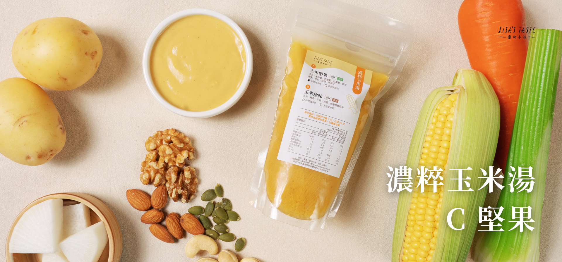 濃粹本味堅持真實地「呈現食物的原始風味」,嚴選全天然食材、全手工製作,推出四款低卡高纖的濃湯 —— 溫潤毛豆、清爽玉米、濃郁芋頭、酸甜蕃茄 —— 共 14 種口味。有葷有素、有鹹有甜。