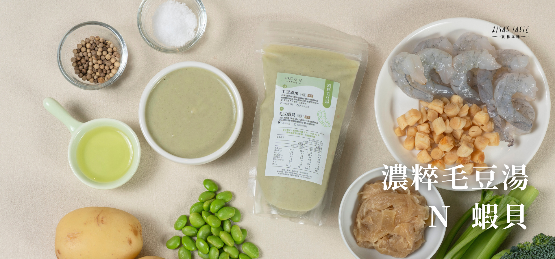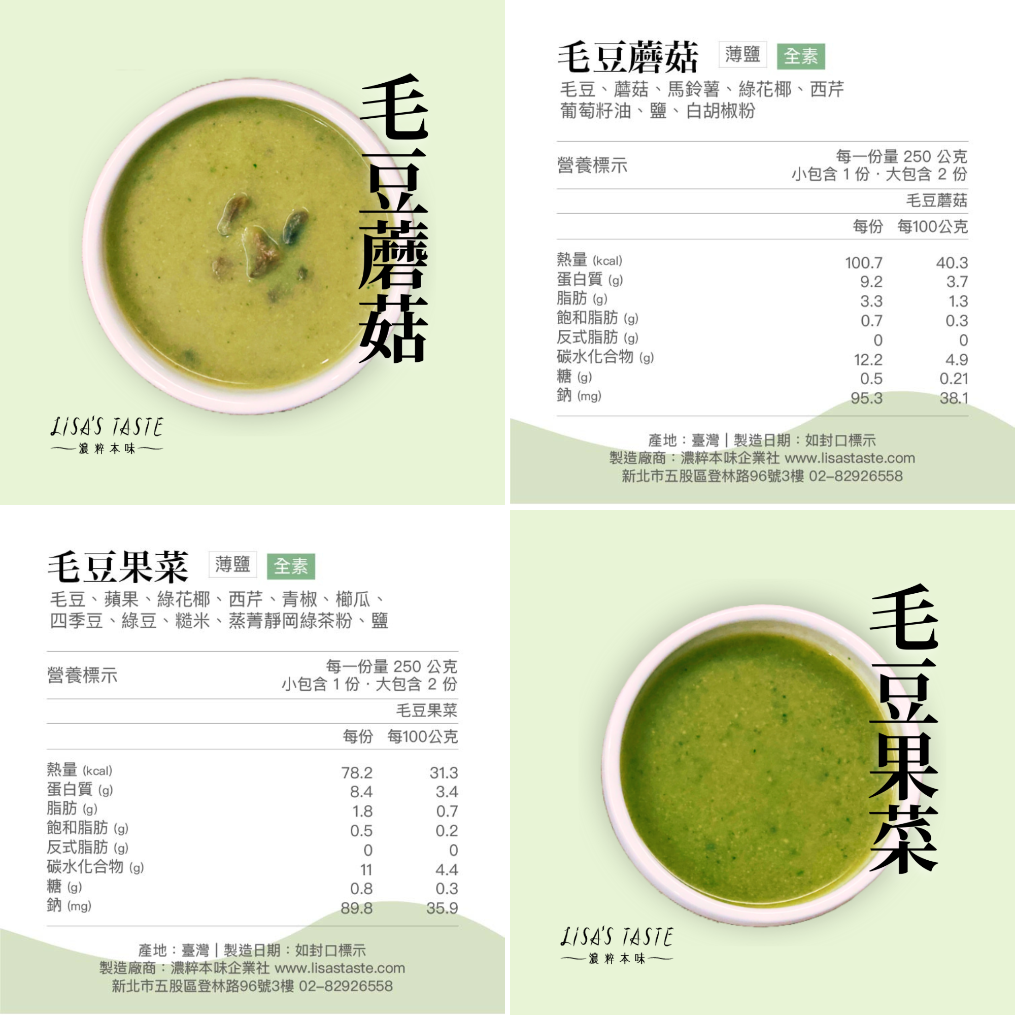濃粹本味堅持真實地「呈現食物的原始風味」,嚴選全天然食材、全手工製作,推出四款低卡高纖的濃湯 —— 溫潤毛豆、清爽玉米、濃郁芋頭、酸甜蕃茄 —— 共 14 種口味。有葷有素、有鹹有甜。